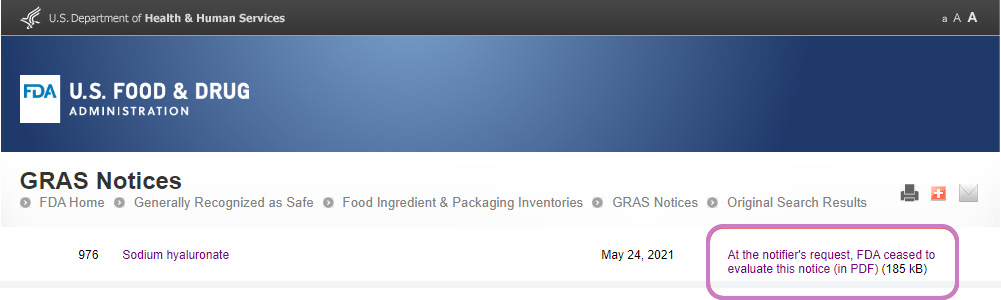 流行鏈球菌玻尿酸曾嘗試申請美國 FDA-GRAS 許可,但 FDA 認定多項安全資料不足,2021 年 5 月 24 日 FDA 公告撤銷審查。